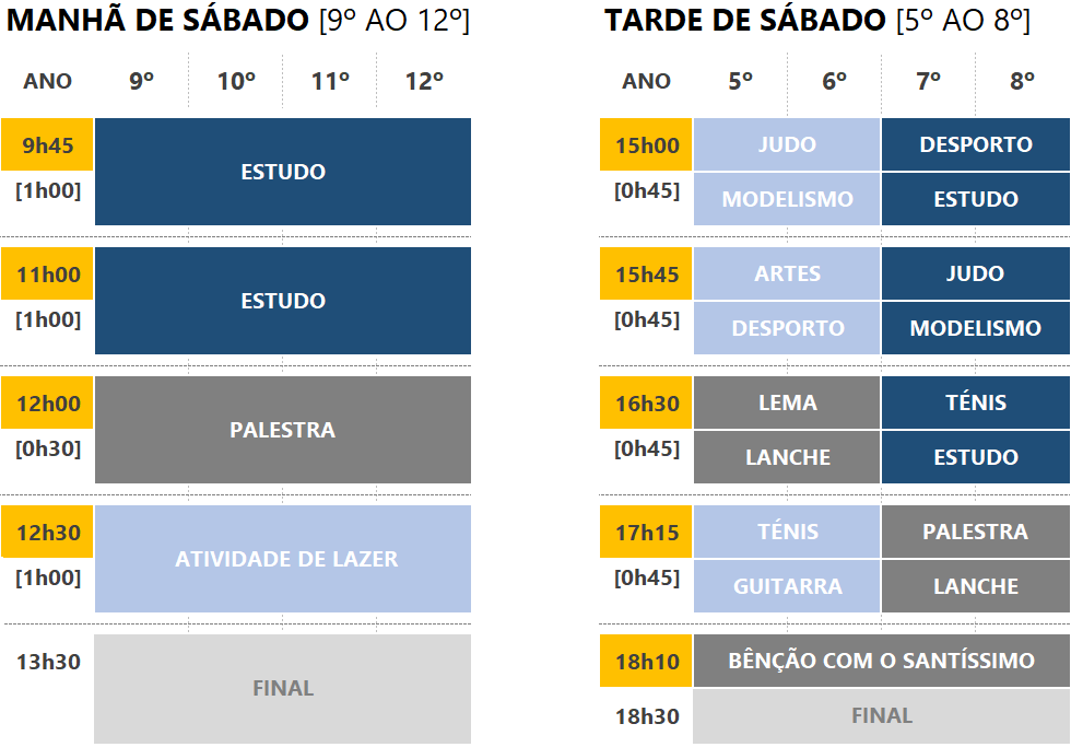 Há quatro tempos de atividades, incluindo formação cristã.